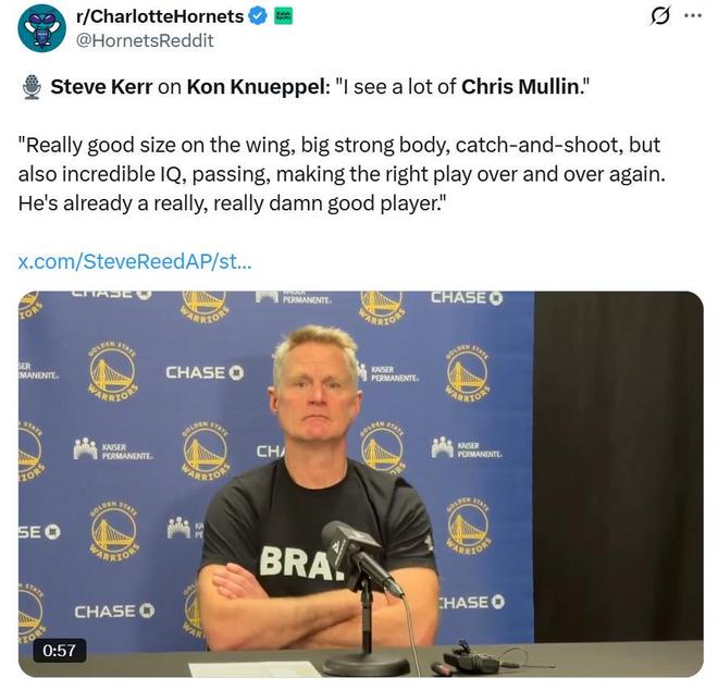 科爾賽后則點評道:“我在他身上看到了克里斯-穆林的影子(NBA75大巨星之一,被譽‘上帝的左手’),他作為一名側翼球員,身材條件非常好,身體很強壯,既能作為空間點接球就投,又擁有極高的籃球智商,可以組織傳球,并且總能做出正確的選擇,總而言之,他已經(jīng)是一名非常優(yōu)秀的球員。”