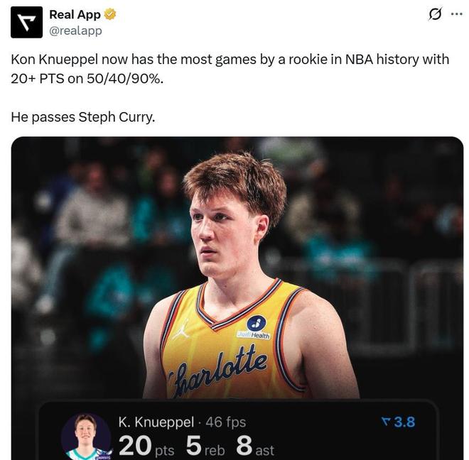 要知道新賽季場次還未過半,克努佩爾就已經(jīng)超過庫里,按照目前的勢頭來看,他勢必大幅刷新庫里保持的這一項NBA歷史神紀錄,也將威脅庫里手中保持的數(shù)項有關新秀的三分投射紀錄。