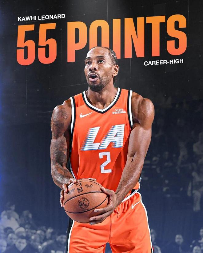 值得一提的是,其中之一,也是倫納德單場(chǎng)最高分就發(fā)生在不到一周前,當(dāng)時(shí)快船112-99大勝活塞,倫納德全場(chǎng)26中17,三分10中5,罰球17中16,拿下55分11籃板2助攻5搶斷3蓋帽。