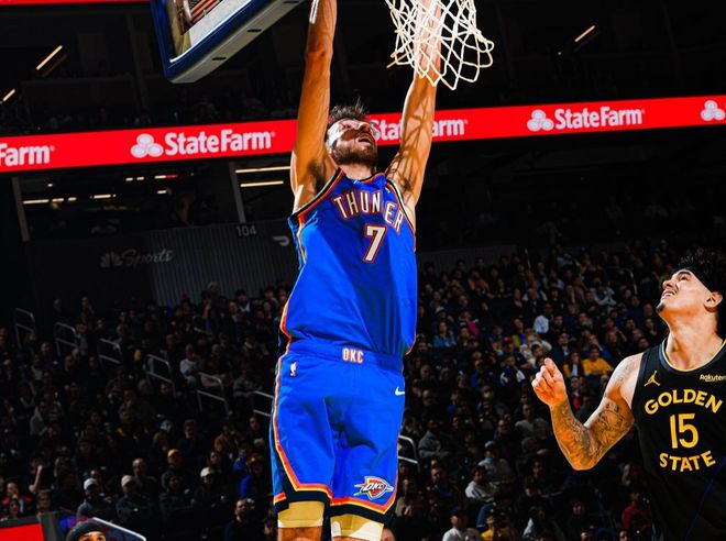 此后霍姆格倫和米切爾下起三分雨,多特命中三分后,雷霆已經(jīng)拉開21分分差。勇士這邊依靠理查德單打獨斗,亞歷山大和多特繼續(xù)內(nèi)外開花,半場雷霆64-45勇士。進入第三節(jié),杰威上籃+亞歷山大單打,雷霆就守在20分分差線上。后半段亞歷山大撤步三分球打破平衡,米切爾突破上籃時,勇士隊員自動讓開一條路!此后維金斯和亞歷山大繼續(xù)下三分雨,霍姆格倫也續(xù)上三分,勇士被徹底打花。三節(jié)打完,雷霆95-66勇士,第四節(jié)失去懸念。最終勇士94-131慘敗雷霆,雷霆迎來四連勝。