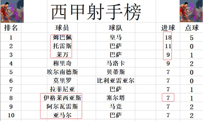 射手榜方面,姆巴佩18球高居榜首,托雷斯今天錯(cuò)失良機(jī)未能破門,還是11球排在第2。萊萬最后打入一球,追上穆里奇,兩人9球并列第3。莫里羅破門,伊格萊西亞斯雙響,兩人追上亞馬爾,阿爾瓦雷斯等人,將前十門檻提高到7球。