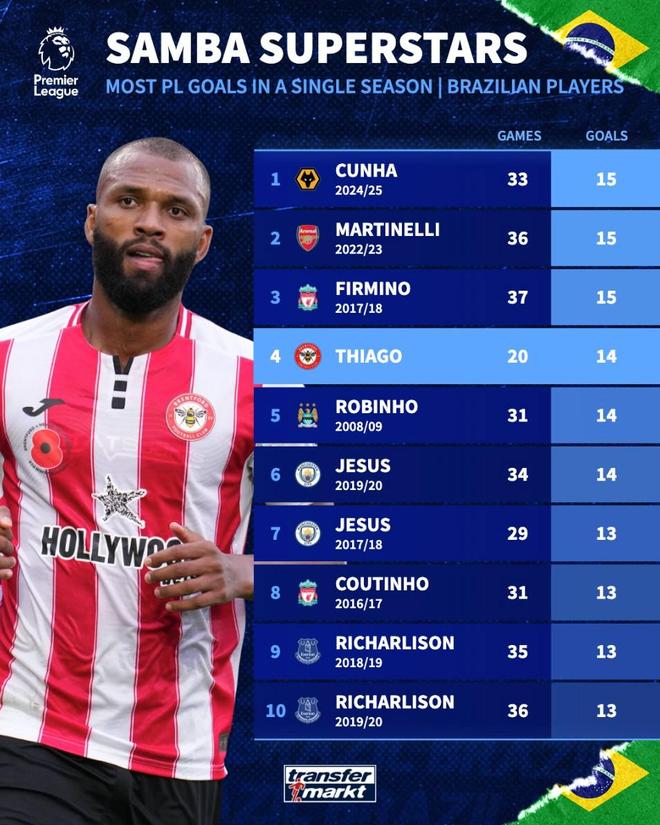 4. 伊戈爾-蒂亞戈 2025-26賽季(布倫特福德) 20場 14球